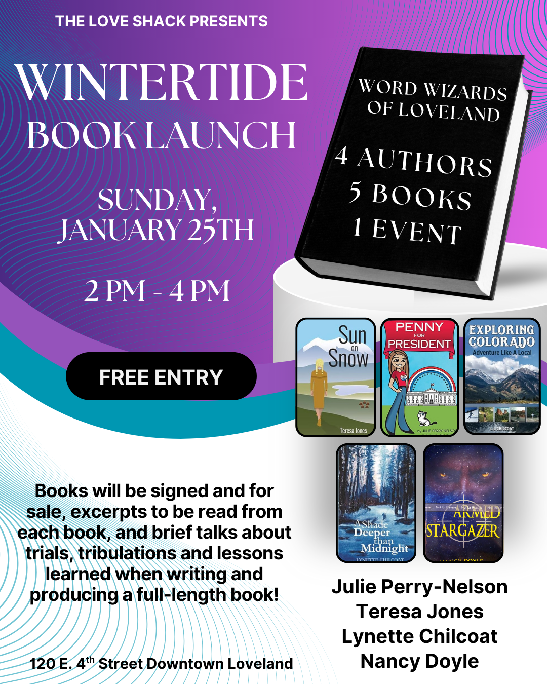 Join us on Sunday, January 25th from 2 to 4 pm for the Wintertide Book Launch event! The Word Wizards of Loveland, a local writer’s group, are celebrating their recently published books! Four of these books are already on the shelves in the Loveland Library and available on Amazon! Their books will be on sale and signed, excerpts will be read from each book, and brief talks about trials, tribulations and lessons learned when writing and producing a full-length book. This event is completely free to the public so let’s show up and show support for our amazing community members!